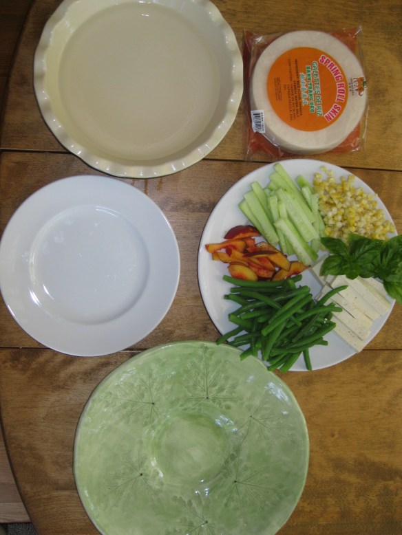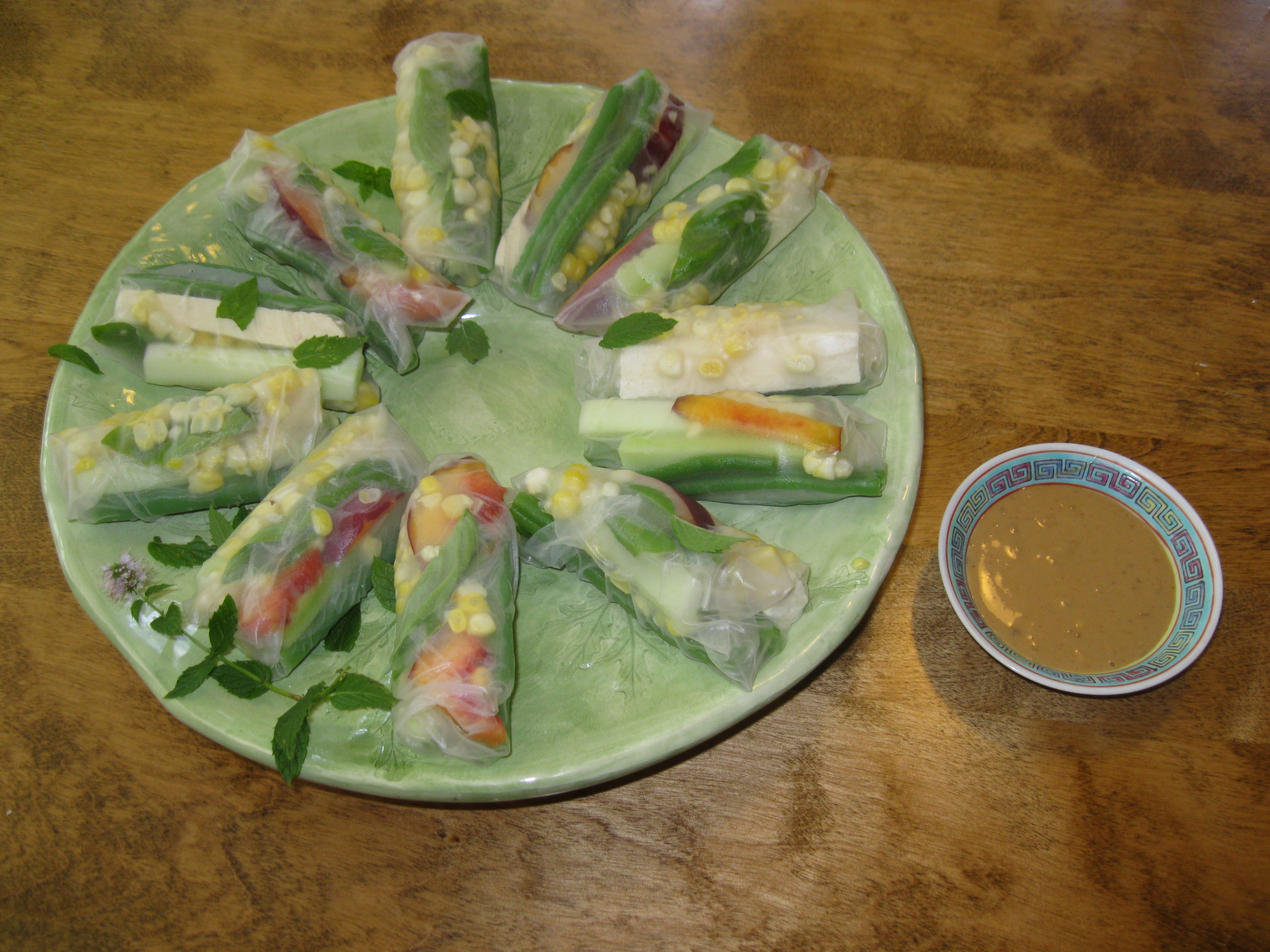 For today’s lunch, I decided to do what real chefs do–go the the farmer’s market (farm stand in my case) and buy what’s fresh. Then roll it in rice wrappers for dipping into a peanut sauce.