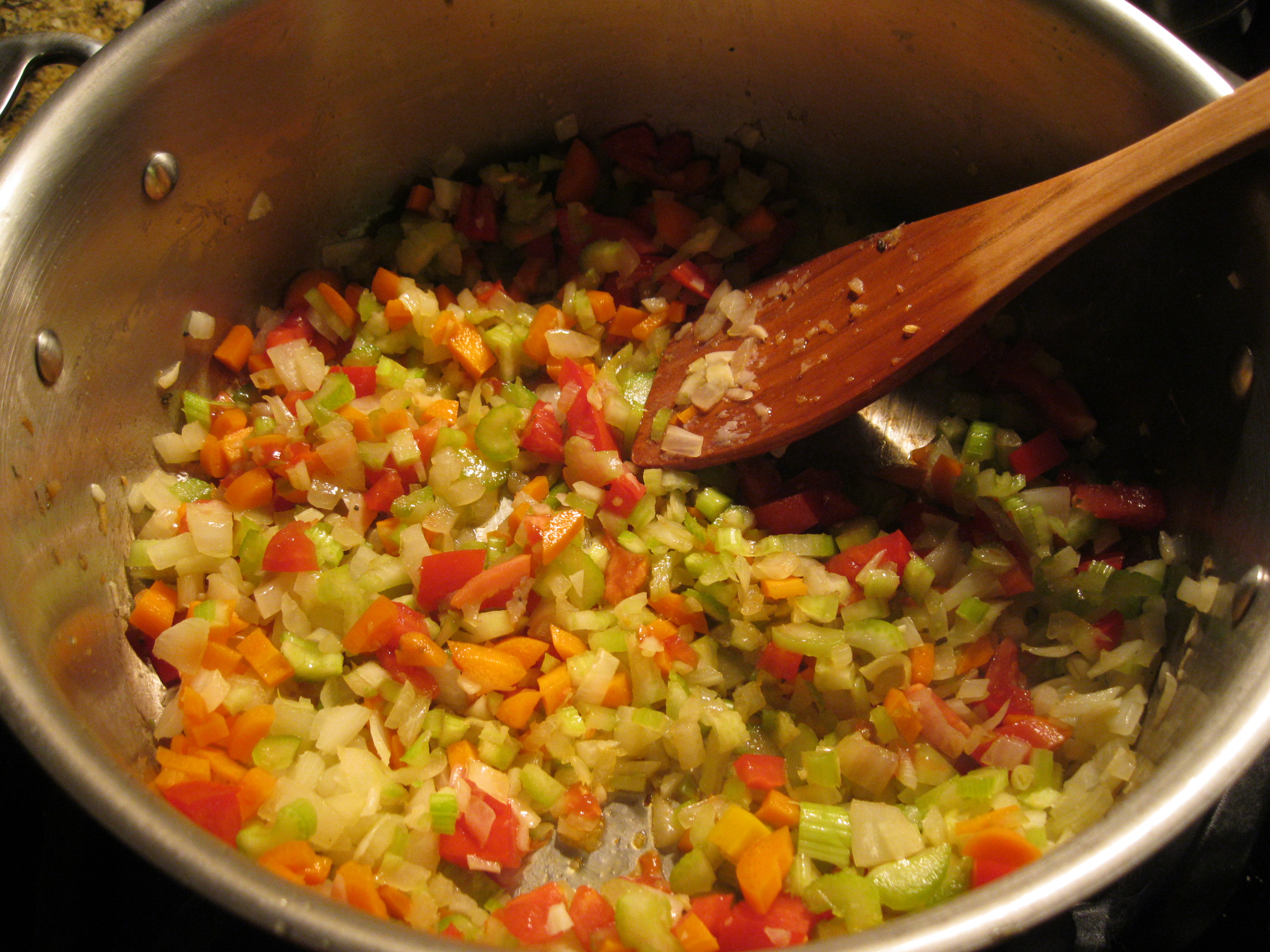 2. In a large soup pot, heat olive oil over medium heat and put in chicken sausage–if using uncooked sausage in a casing, cut open the casing and squeeze the sausage into the pan and break it into pieces with a wooden spoon. Turn heat to medium high and stir frequently to brown sausage bits on all sides. When fully cooked and nicely browned, spoon out sausage into a bowl.