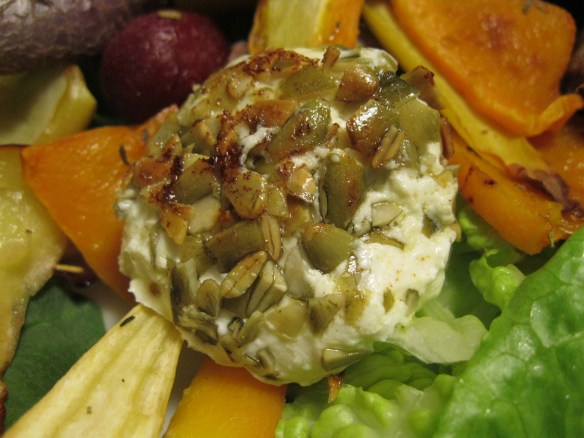 Roasted apple, root vegetable, and pumpkin seed crusted goat cheese salad