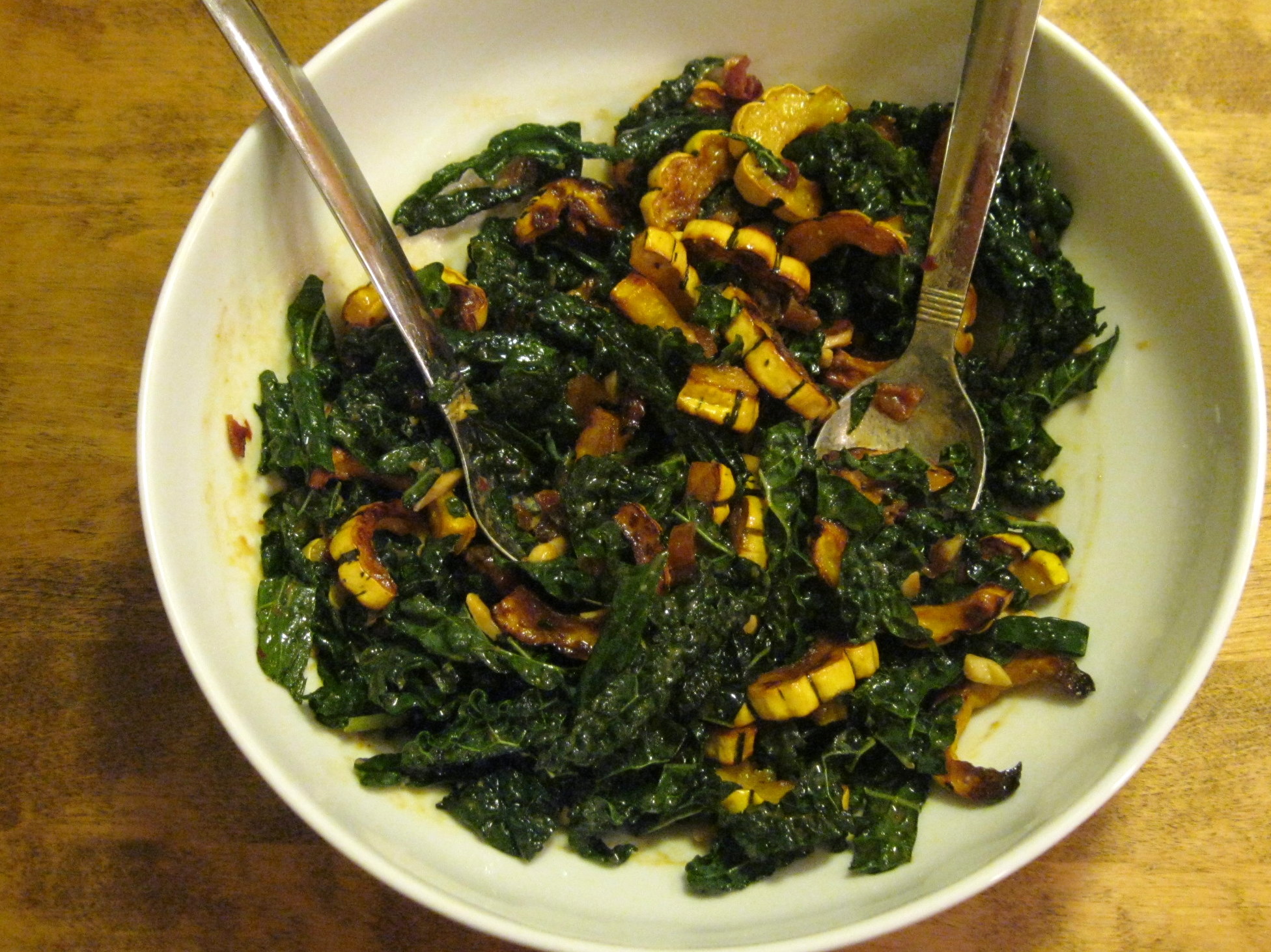 The harissa miso dressing in the 101 cookbooks recipe was the perfect salty, spicy friend for the squash and the kale. But what if it this dish was more about the kale than the squash, and it had some dates for sweetness and bacon for rich smokeyness?