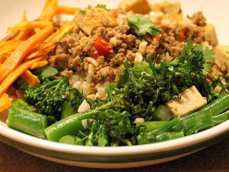 I like firm tofu, pan fried at high heat with very little oil, but if you like softer, silken tofu, use that instead and skip the sauteeing step at the beginning. Also, I steamed broccolini and roasted strips of sweet potatoes to add some color and vegetables to the dish.