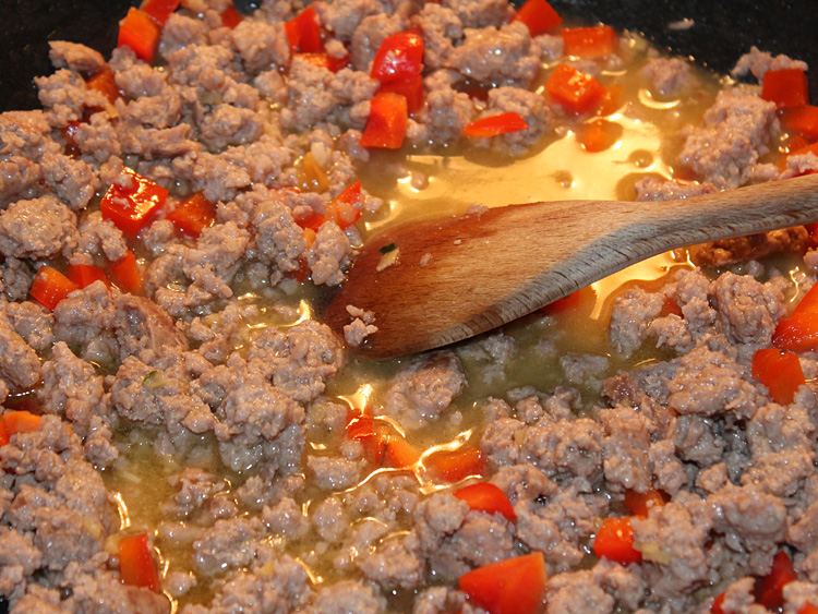 5. While the sweet potatoes and broccoli are cooking, heat 2 TBS oil on medium high heat in a large nonstick stir fry pan. Add the garlic, ginger, and hot red pepper flakes, stir, and add in the pork. Break up the pork into small pieces with your spatula or wooden spoon and stir every few minutes. Cook until the pork is mostly cooked through and not pink.