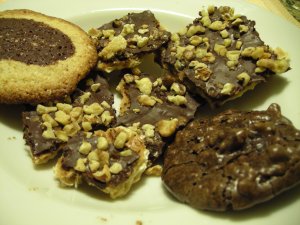 I’m going to describe the dessert first, because we all wanted to have the dessert first once we saw what it was. My lovely baker friend made Smitten Kitchen’s hazelnut chocolate thumbprint cookies and chocolate caramel crack, and Payard’s flourless chocolate walnut cookies.