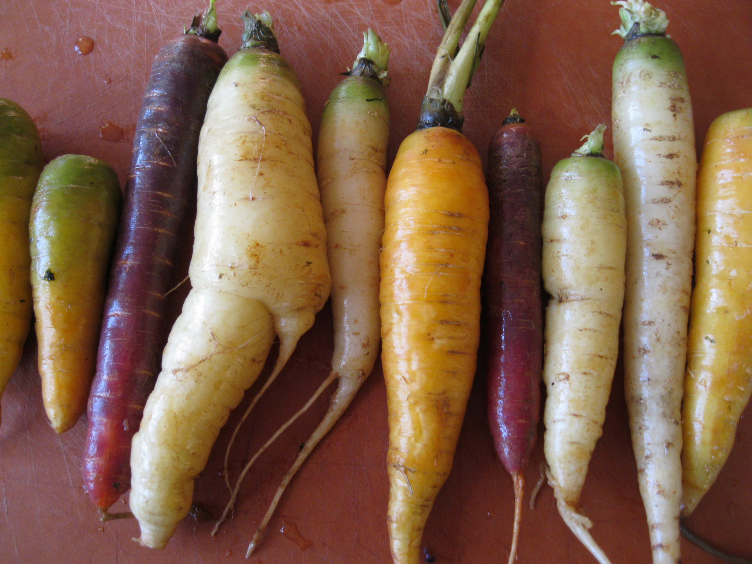 I’m a sucker for vegetables in their nonstandard colors. A couple weeks’ back I bought a purple cauliflower because I thought it was pretty and it went with my sweater. Then I picked up these beautiful carrots: