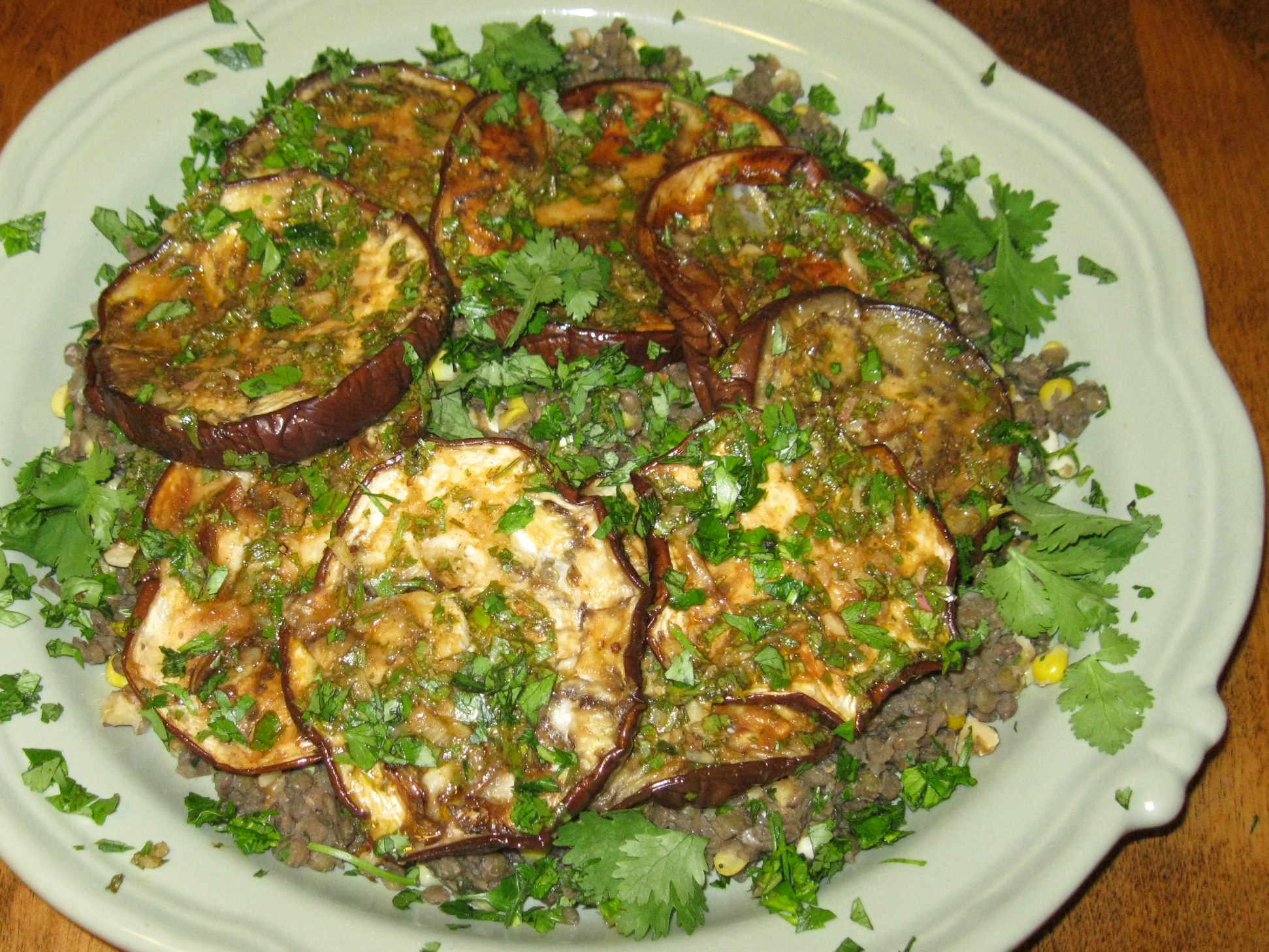 eggplant, lentils, and corn with charmoulaEggplant was not my friend until I learned how good it can be when it’s fresh or if you’ve salted it to remove any bitterness. Eggplant is plentiful at the farmstands and farmer’s markets right now, and lends itself to so many dishes, including a rolatini with goat cheese and pesto. eggplants at farm