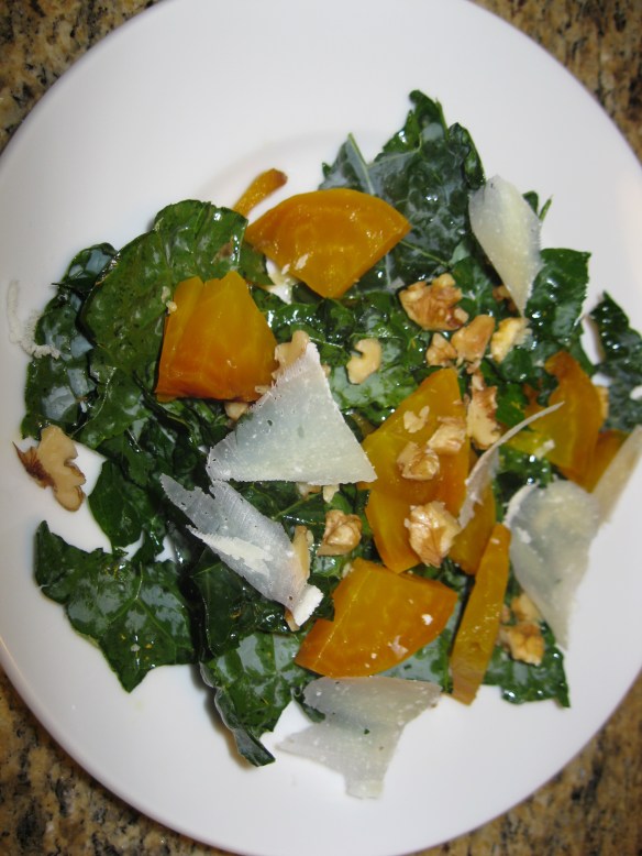 Golden beets have become a recent favorite. I’ve been preparing them using Mark Bittman’s good advice of wrapping cleaned and trimmed individual beets in foil and baking them at 400 degrees until a sharp knife slides easily through them. After they cool, you peel them and eat them or put them in the refrigerator for later. They find their way into salad, sandwiches (with goat cheese and arugula), and maybe even a dessert (shhhhh…).